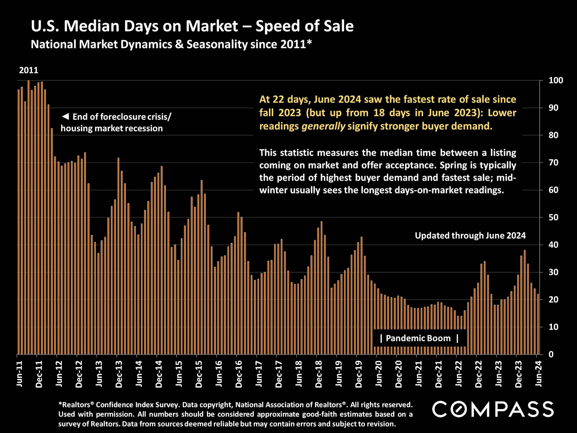 Over the past 13 years, it's rather startling to see the dramatic reduction in the amount of time between when a listing hits the open market and when an offer is accepted: from 100 days in December 2011 to 22 days in June 2024.